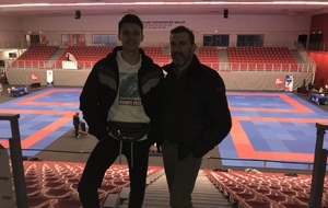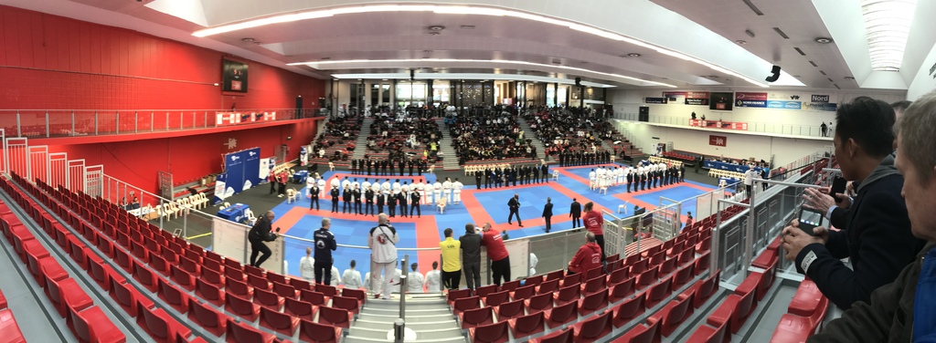 9h50 : En préparation, Jules en rouge (gojushiho sho), rouge (Lilian Gaillou) shito ryu. Début 10h00, tapis 4. Résultat 1/4.