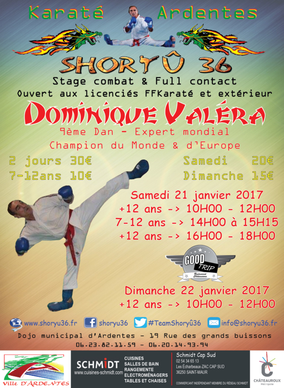 Le Club de Karaté d'Ardentes organise le 21.22 janvier 2017, son stage Combats et Full-Contact avec l'Expert Fédéral : Dominique VALÉRA.