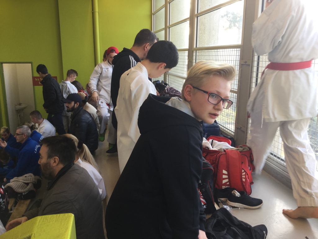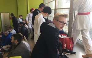 Jules concentré et soutenu par Thomas, ne veut pas laisser s'échapper la 1ère place. Les 2 adversaires se croisent du regard avant le tour Kata. Jules sort son Kata favori Kanku-sho et engrangent l'unanimité des drapeaux des 5 juges, 5/0.