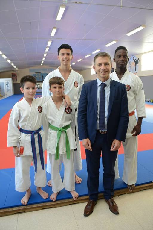 Gil Avérous (Maire de Châteauroux et Président de Châteauroux Métropole), Francis Didier (Président de FFKDA), Chantal Marmion (Présidente de la Ligue de Karaté du Centre-Val de Loire), Marc Fleuret (Maire-adjoint chargé des Sports), Dominique Charré (DTN à la FFKDA).